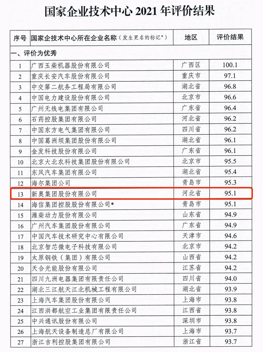 2022年年初,国家发展和改革委员会办公厅公布了国家企业技术中心2021年评价结果,包括新奥集团在内的72家企业技术中心获评“2021年优秀企业技术中心”。国家企业技术中心评价是由国家多部委联合组织,全国各行业排头企业参加的两年一度的企业创新中心评比排序。本次参评的企业技术中心的企业达1728家,比2019年多了两百多家。其中,包括新奥集团、中国电力建设、中国葛洲坝集团、中国石油天然气股份有限公司在内的72家企业技术中心得分在90分以上,一同被评为“2021年优秀企业技术中心”。新奥以95.1分的成绩在全部参评企业中位列第13名,这也是新奥集团连续两个评价年度被评为国家优秀企业技术中心。