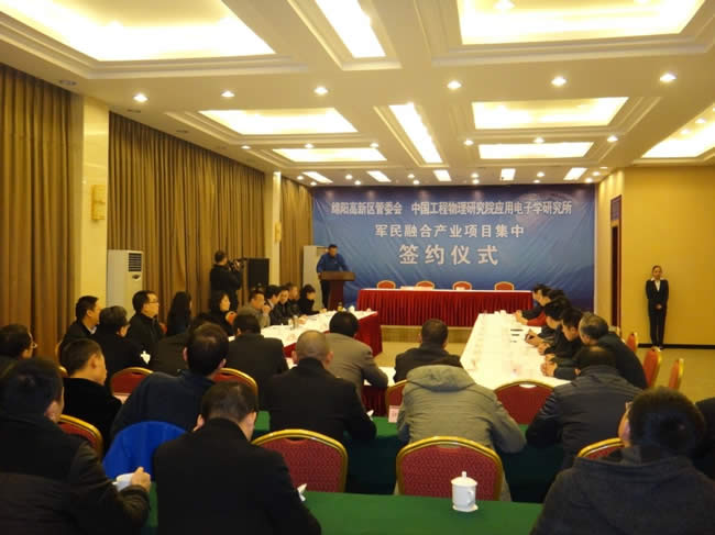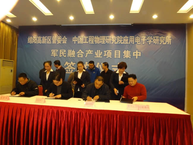 2013年12月9日,绵阳高新区管委会与中物院应用电子学研究所7个军民融合产业项目在长虹酒店举行签约仪式。市委常委颜超、绵阳市副市长唐凤泉、绵阳高新区党工委书记羊群、管委会主任魏德谦、中物院应用电子学研究所所长许州、副所长陈门雪、计划处处长李红波等领导及迪派锐科技、九九天目等签约项目负责人出席了签约仪式。出席签约仪式的还有发改委、经信委、财政局、科技局、规划局等市级部门及高新区各部门。 会上,应用电子学研究所计划处处长李红波首先向入会领导介绍了军民融合产业园项目情况,重点介绍了迪派锐科技的“数字化管道焊缝检测系统”及九九天目的“牙科CT系统”两个项目。应用电子学研究所所长许州、高新区党工委书记羊群、市委常委颜超分别做了重要讲话。最后,由市委常委颜超等领导共同见证,高新区管委会与中物院应用电子学研究所及园区企业共同签署了战略合作协议。 协议的签署充分证明绵阳科技城对中物院应用电子学研究所军民融合的肯定与支持,也充分表明中物院应用电子学研究所积极推动绵阳科技城建设的决心和信心。入驻“军民融合产业园”后,迪派锐科技定将在国家各部委、省委、省政府、市委、市政府的正确领导下,贯彻落实科学发展观,坚持走中国特色自主创新道路,一方面不断加强核心技术研发,推陈出新,将军工技术转民用,将高新技术成果转化为现实生产力,另一方面以市场为导向,将高新技术成果推向市场,增收创收,回报政府,回报社会,回报人民,为打造国家一流的高科技企业作出新的贡献。