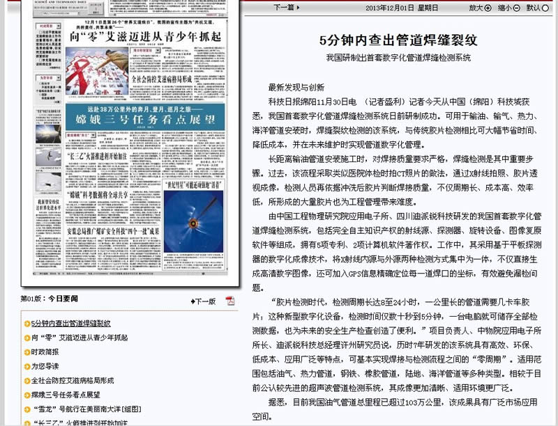 新华网-国内首套数字化管道焊缝检测设备在绵阳发布